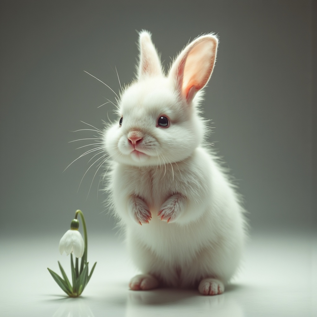 A fluffy white rabbit poses upright next to a blooming snowdrop flower, showcasing its curious nature in a softly lit setting.