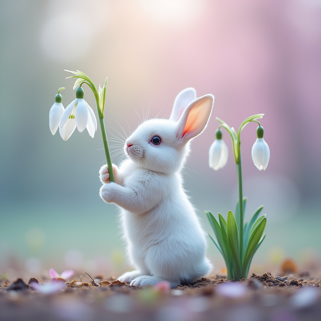 A small white rabbit holds a green stem with snowdrop flowers while surrounded by blooming nature on a sunny spring day.