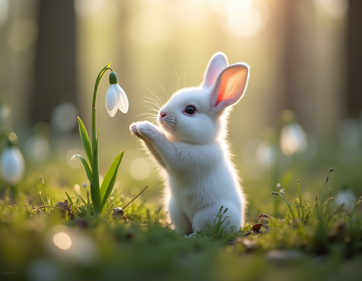 A small white rabbit interacts with a snowdrop flower in a sunlit forest, enjoying the beauty of spring and nature's awakening.