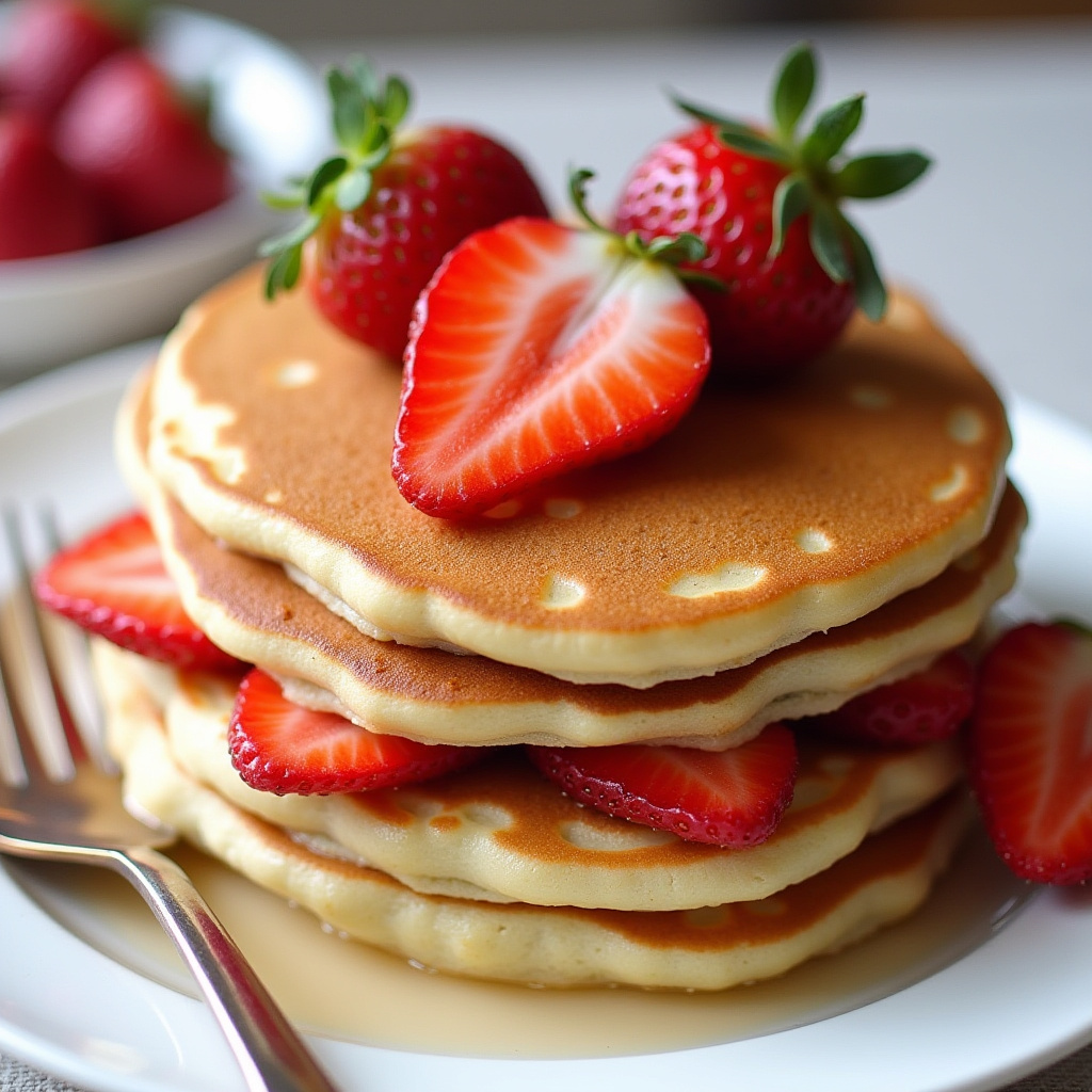 Fluffy pancakes are stacked high, adorned with sliced strawberries and drizzled with syrup, creating a delicious breakfast scene.