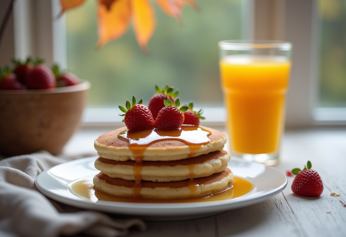 Mouthwatering stacks of pancakes topped with fresh strawberries and syrup, accompanied by a glass of orange juice. Morning delight in a cozy setting.