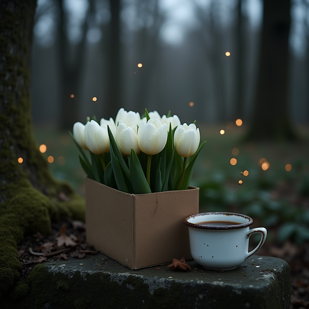White tulips in a box sit beside a cup of coffee in a peaceful forest, softly illuminated by glowing lights during twilight hours.