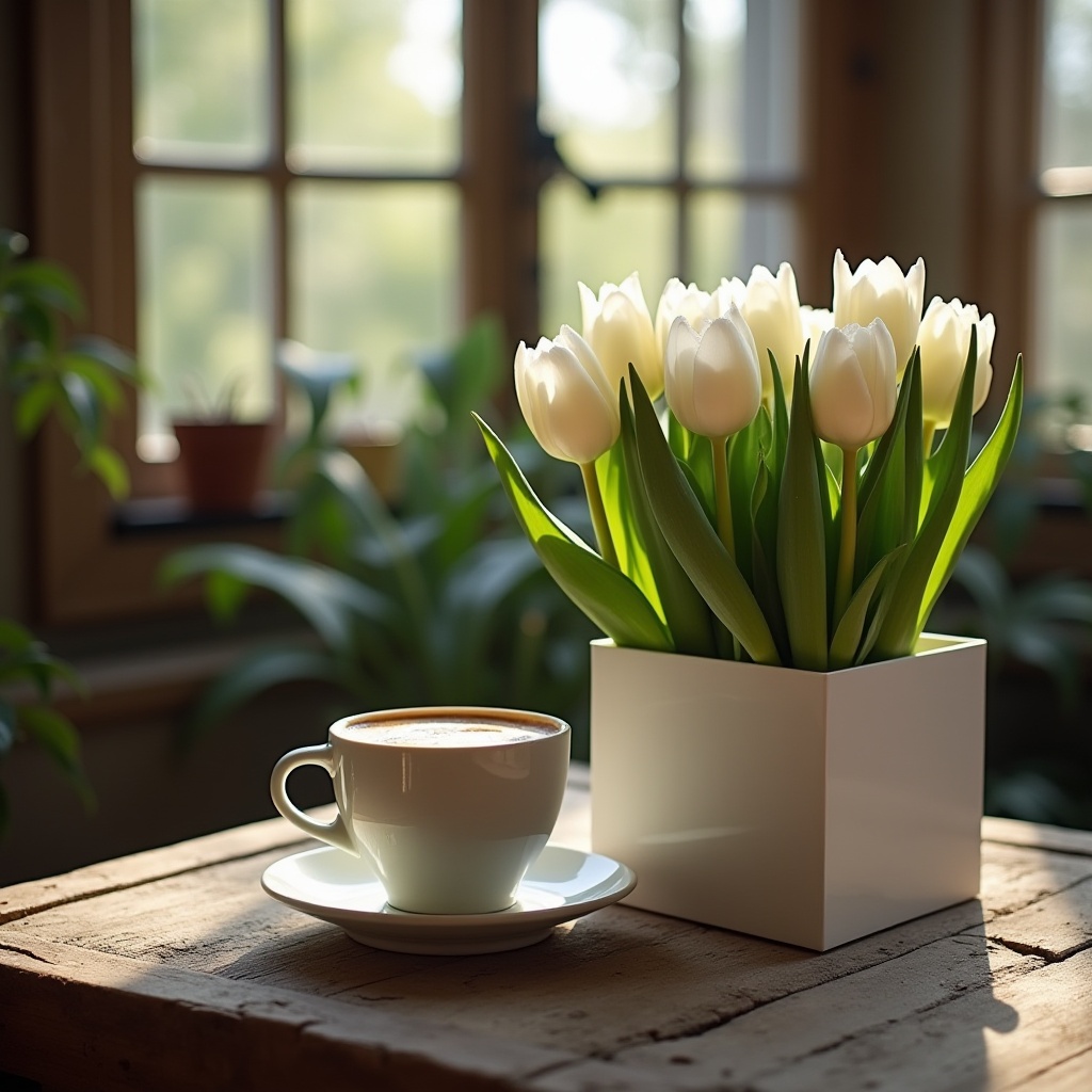 A cozy setting features a cup of coffee beside a square vase filled with white tulips near a window, creating a serene atmosphere.