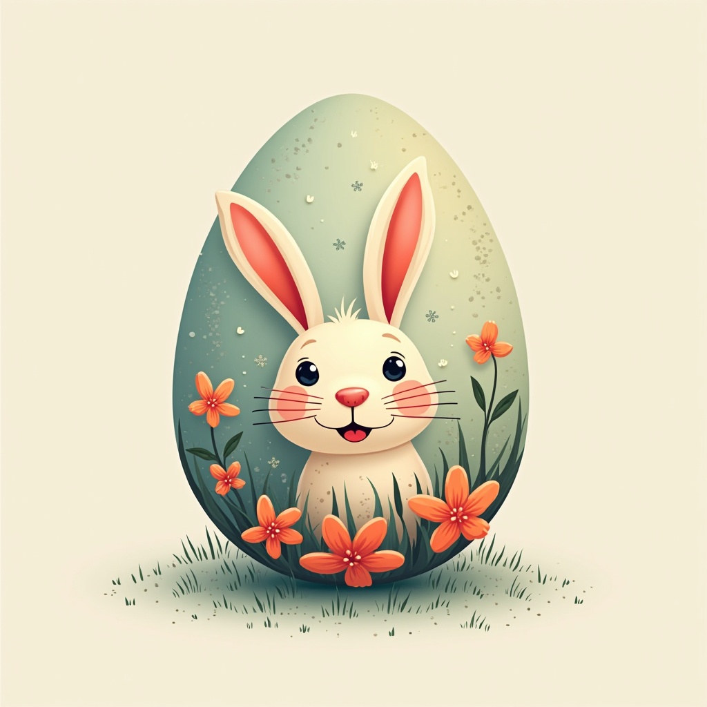 A playful bunny peeks out from a colorful egg, surrounded by vibrant flowers and green grass, creating a cheerful spring atmosphere.