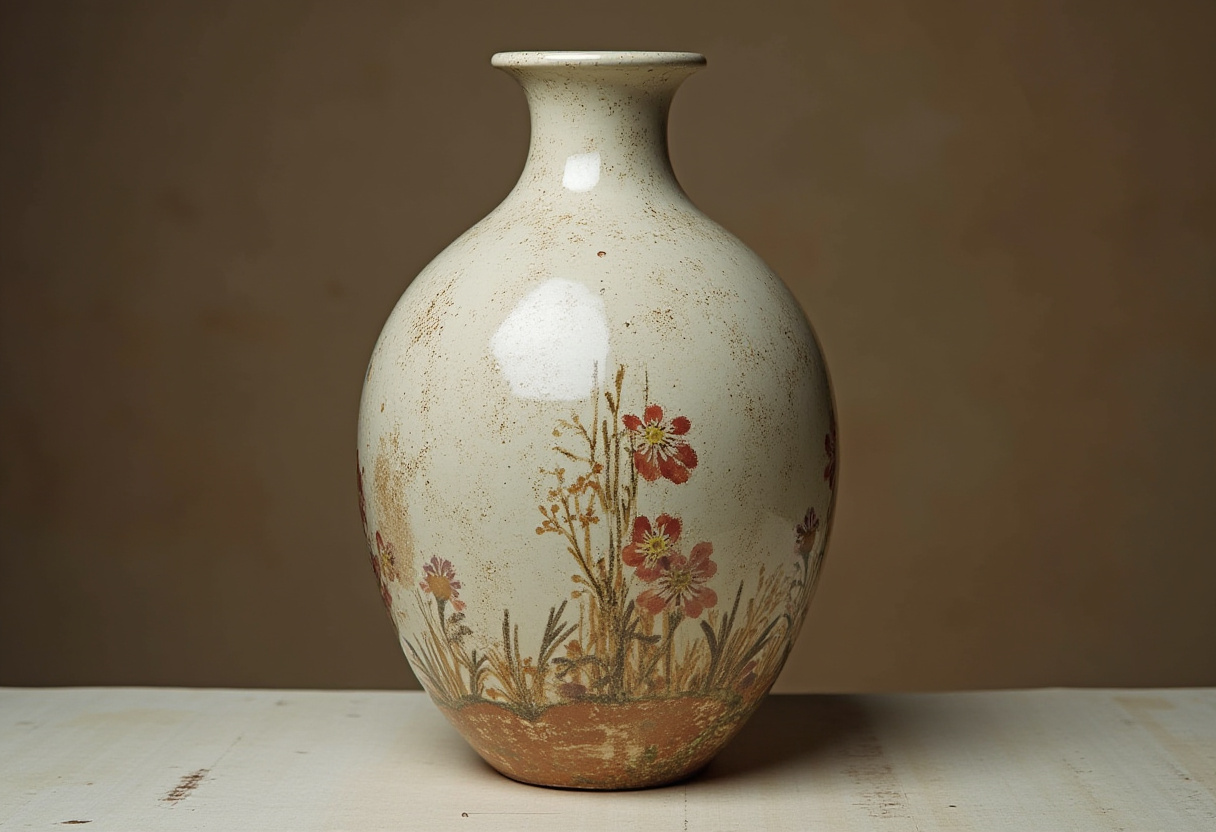 aesthetic, artistry, beautiful, ceramic, color contrast, craftsmanship, decoration, detailed, elegant, floral design, handcrafted, handmade, home decor, neutral background, pottery, still life, surface texture, traditional, vase, vintage style