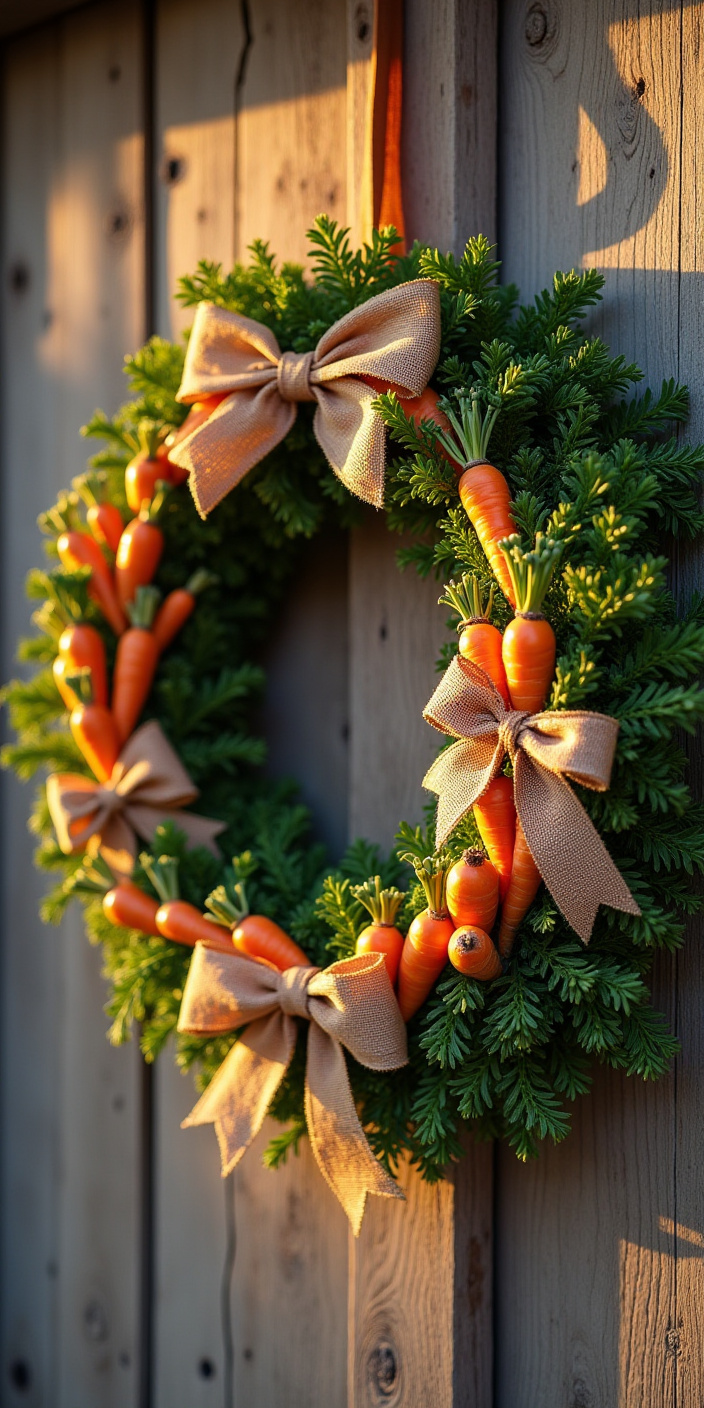 DIY project, autumn decor, bows, bright colors, carrot wreath, carrots, craftsmanship, decorative art, festive wreath, greenery, handmade craft, holiday ornaments, home design, indoors, nature elements, organic materials, rustic home, seasonal decoration, wall decor, wooden wall