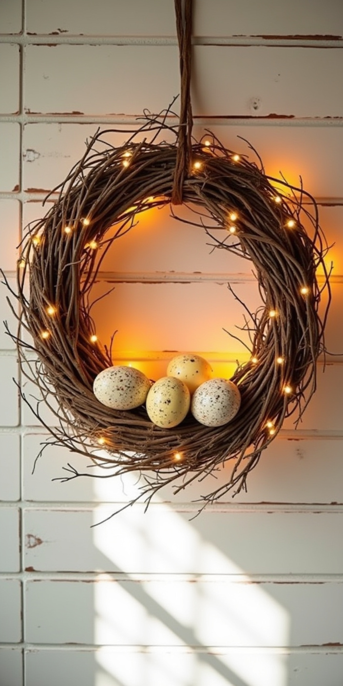 This beautiful wreath features twigs and fairy lights, highlighting speckled eggs, perfect for spring decor in a cozy interior.