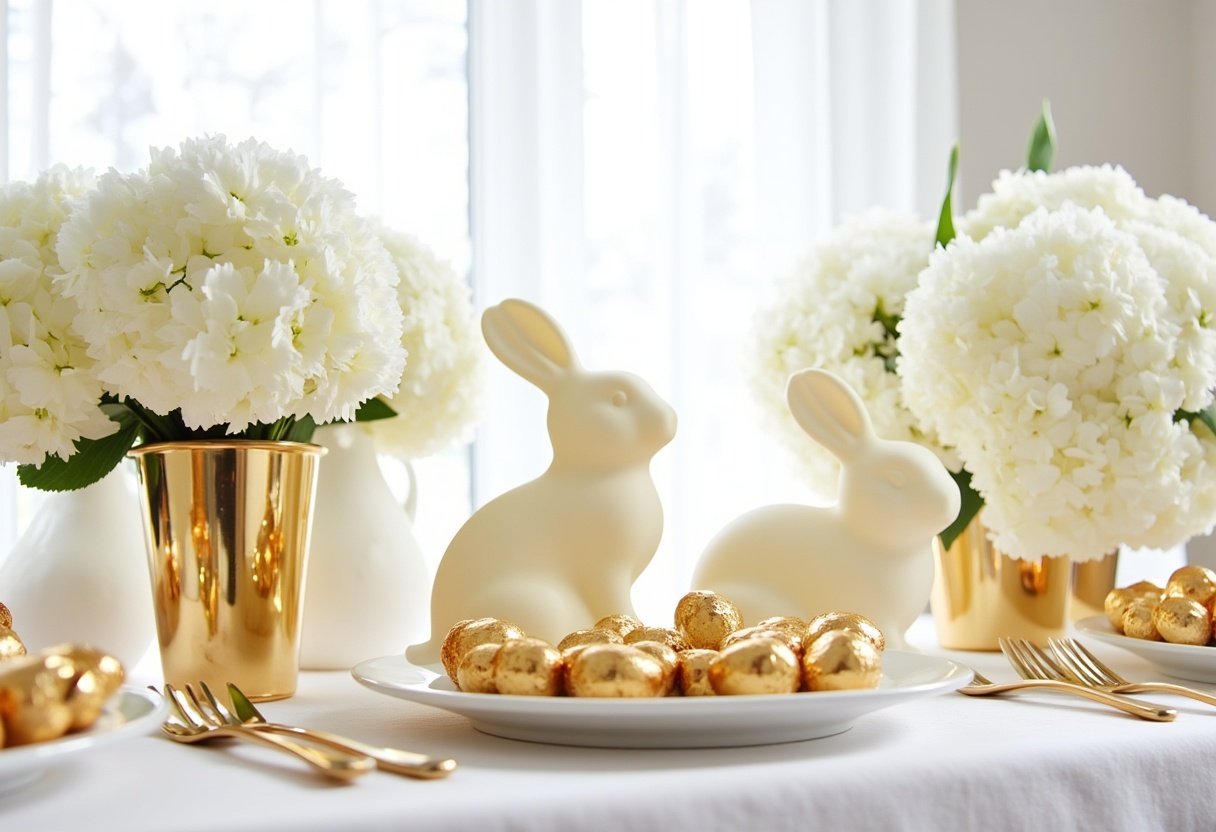 A beautifully arranged table featuring white flowers, golden eggs, and decorative bunnies, perfect for a spring celebration or brunch.