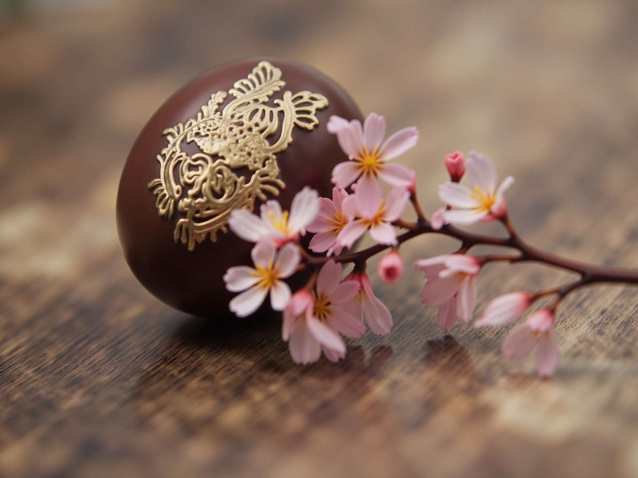 Delicate cherry blossoms surround an ornately decorated egg, embodying the essence of spring and new beginnings in a serene setting.