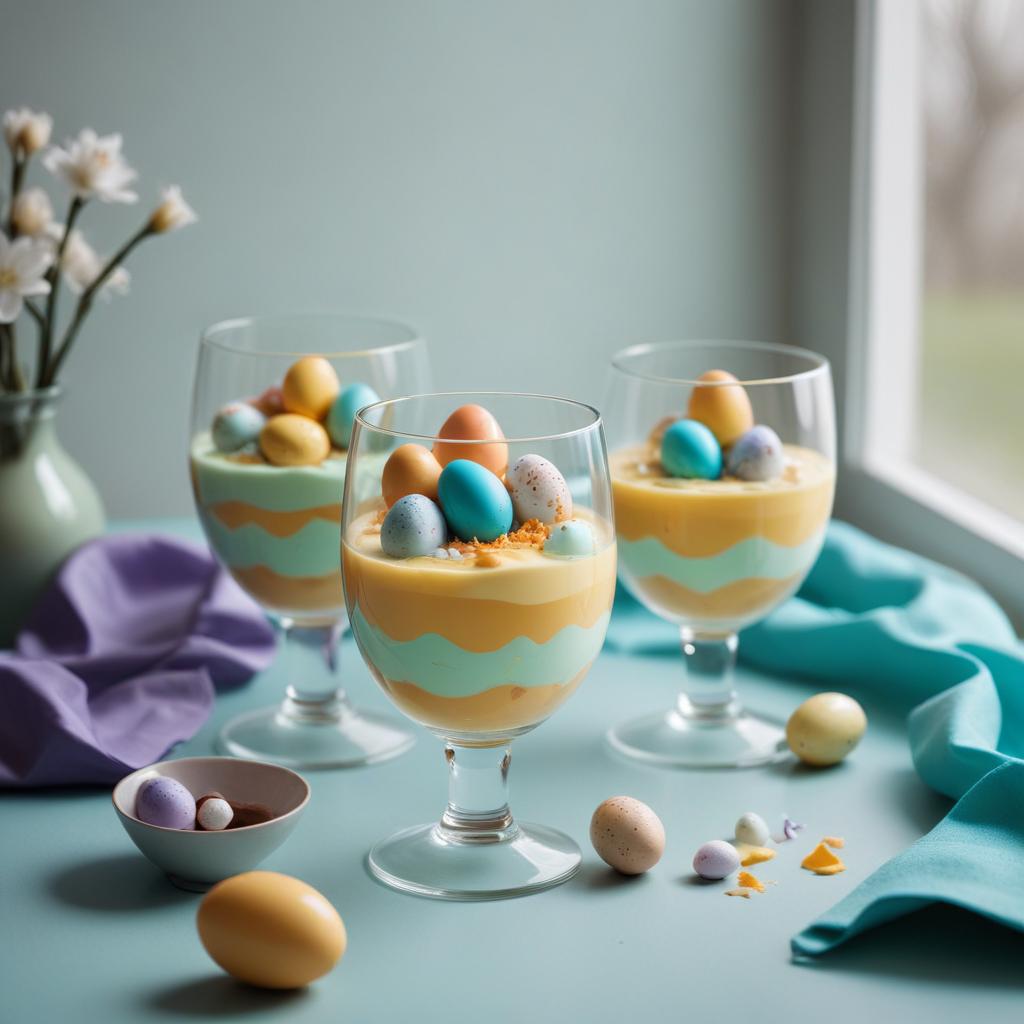 Vibrant spring desserts feature layers of custard topped with decorative Easter eggs. Perfect for seasonal celebrations and gatherings.