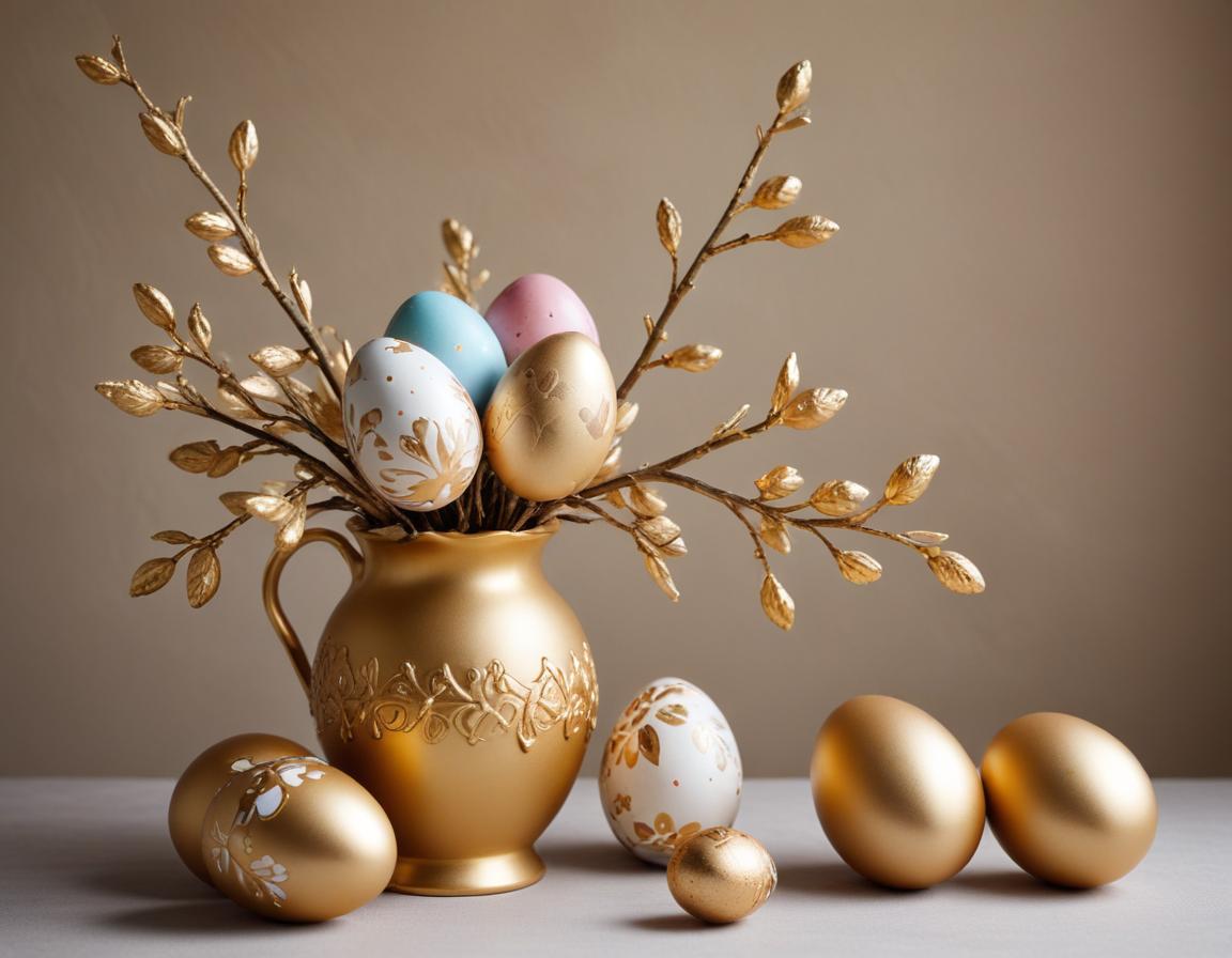 arrangement, art, branches, celebration, colorful, decorative, design, easter, eggs, festive, floral, golden, holiday, home decor, nature, ornament, party, spring, tradition, vase