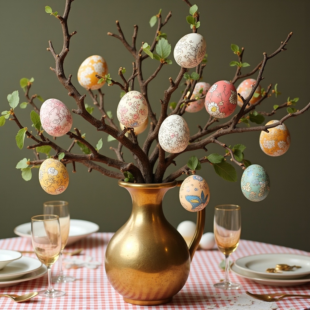 A golden pitcher holds a branch adorned with colorful painted eggs. The festive setup includes a checkered tablecloth and elegant glassware.