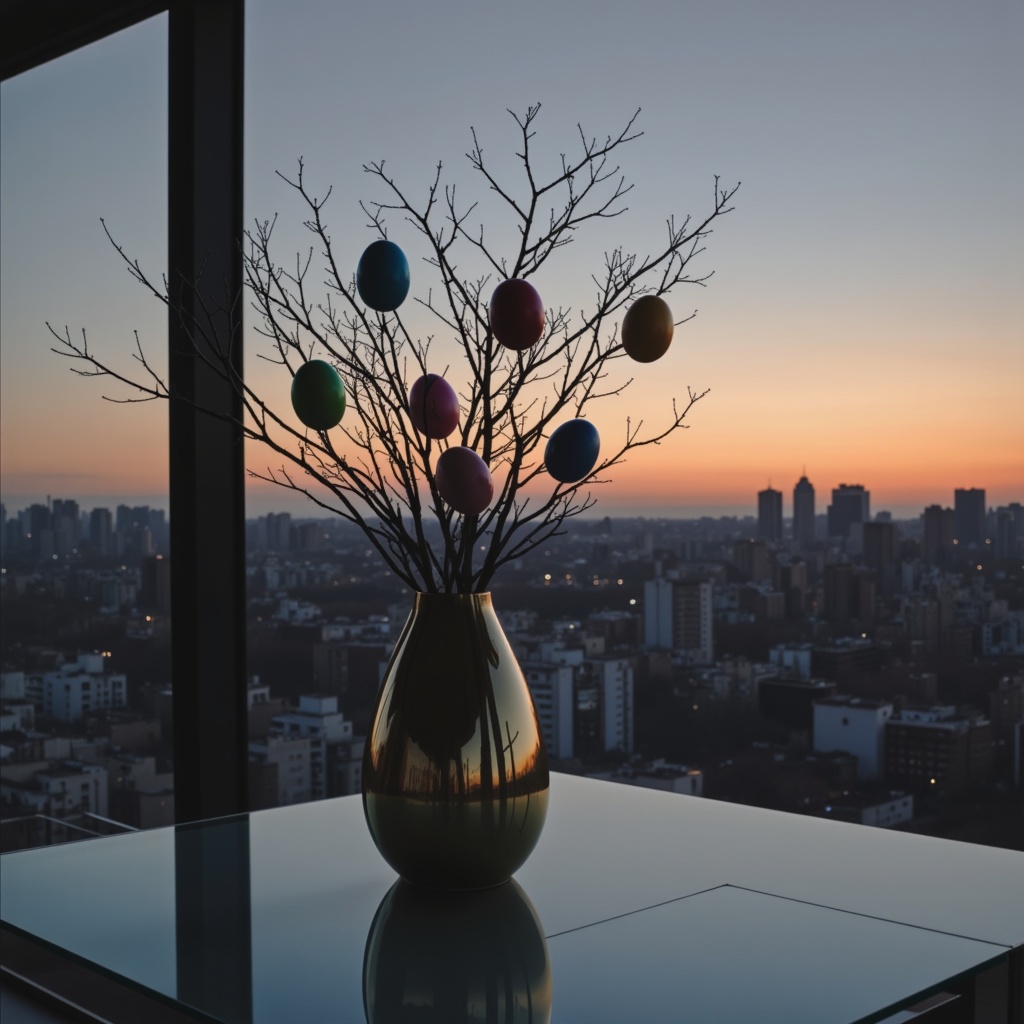 architecture, celebration, city skyline, color, decorative branches, dusk, eggs, festive, glass, home decor, interior design, minimalist, nature, seasonal, silhouette, spring, sunset, tranquility, urban, vase