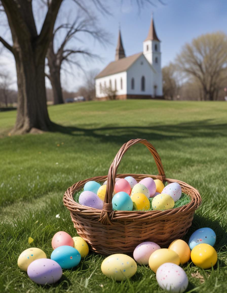 Colorful decorated eggs fill a basket placed in green grass, with a charming church visible in the background during a clear spring day.