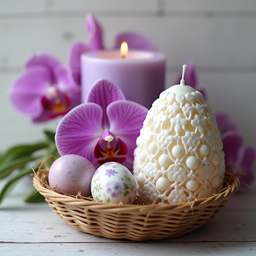 A decorative basket features a white candle, colorful eggs, and vibrant orchids, creating a festive Easter ambiance in a cozy setting.