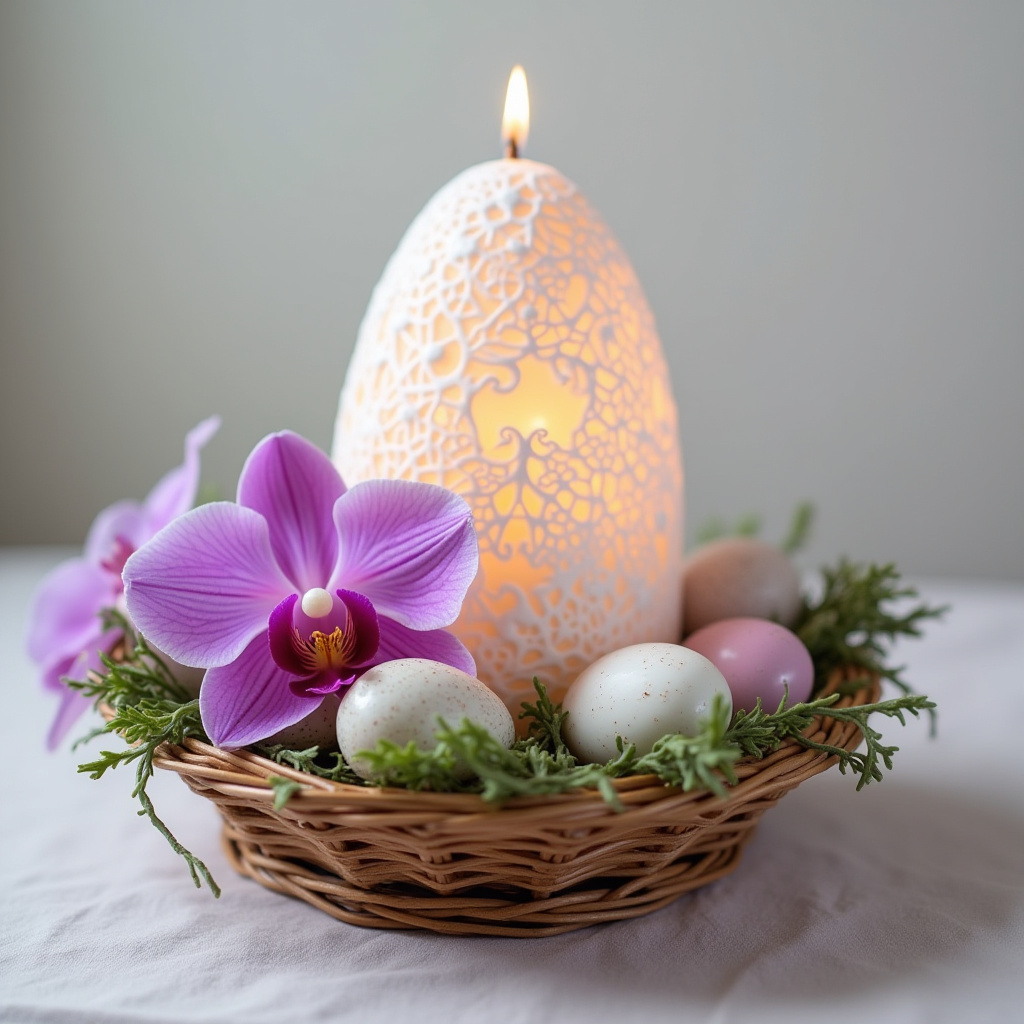 basket, candle, celebration, centerpiece, decoration, easter egg, festive, floral arrangement, flowers, handmade, holiday, home decor, natural elements, orchids, pastel colors, seasonal decor, soft lighting, spring, table setting, tradition