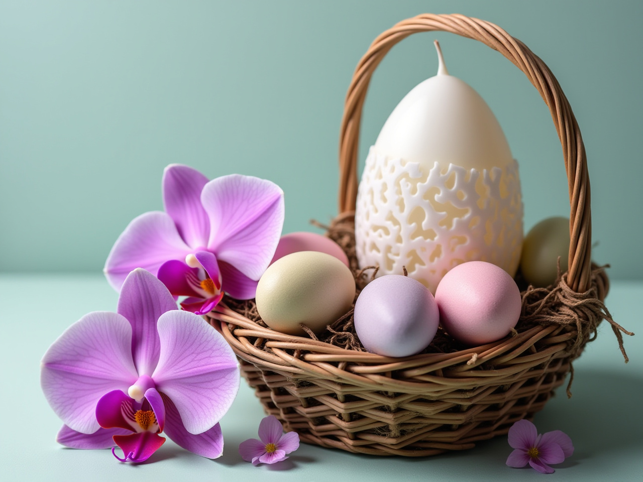 A decorative basket holds pastel-colored eggs and a unique white egg, accompanied by vibrant orchids, creating a festive display.
