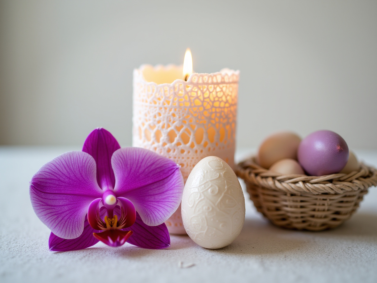 A colorful spring display features an orchid, decorated eggs, and a lit candle, creating a serene atmosphere perfect for celebration.