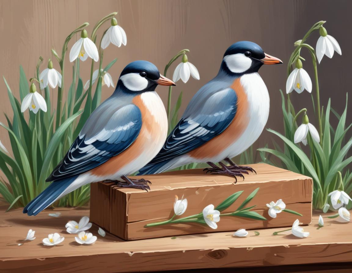 Two colorful birds stand on a wooden box surrounded by snowdrop flowers. The scene captures a serene moment in nature during spring.