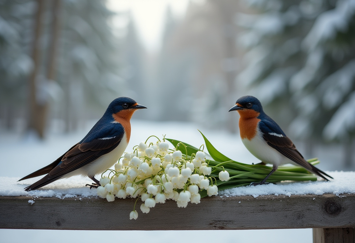 Two vibrant birds are perched next to a bouquet of white flowers on a snowy ledge, set in a tranquil winter landscape.