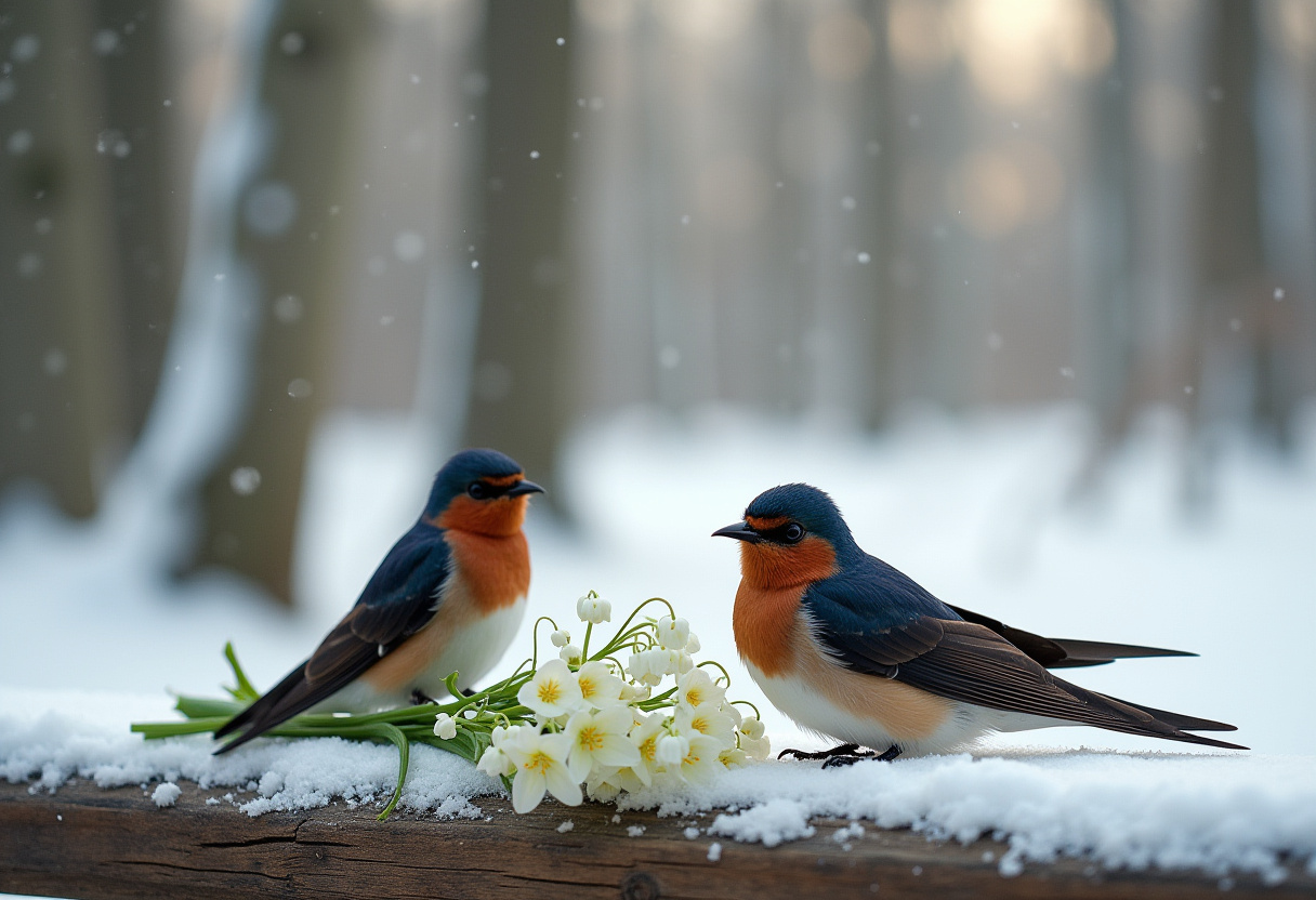 Two vibrant swallows stand on a snowy log, surrounded by delicate white flowers, in a tranquil forest during winter's end.