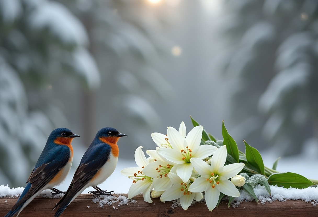 Birds and flowers in a snowy forest setting