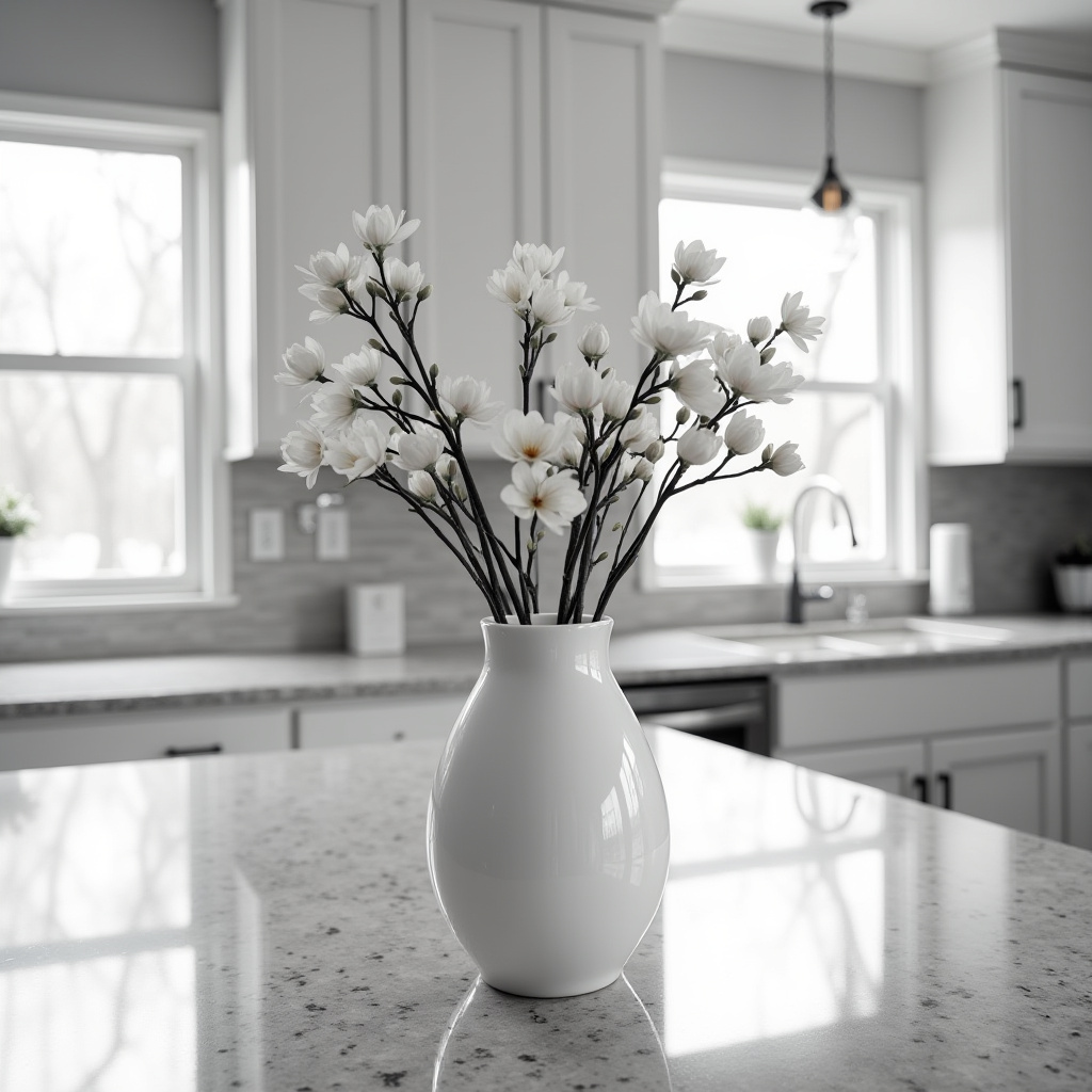 A well-lit kitchen features a white vase filled with delicate flowers, enhancing the serene atmosphere in the cozy space.