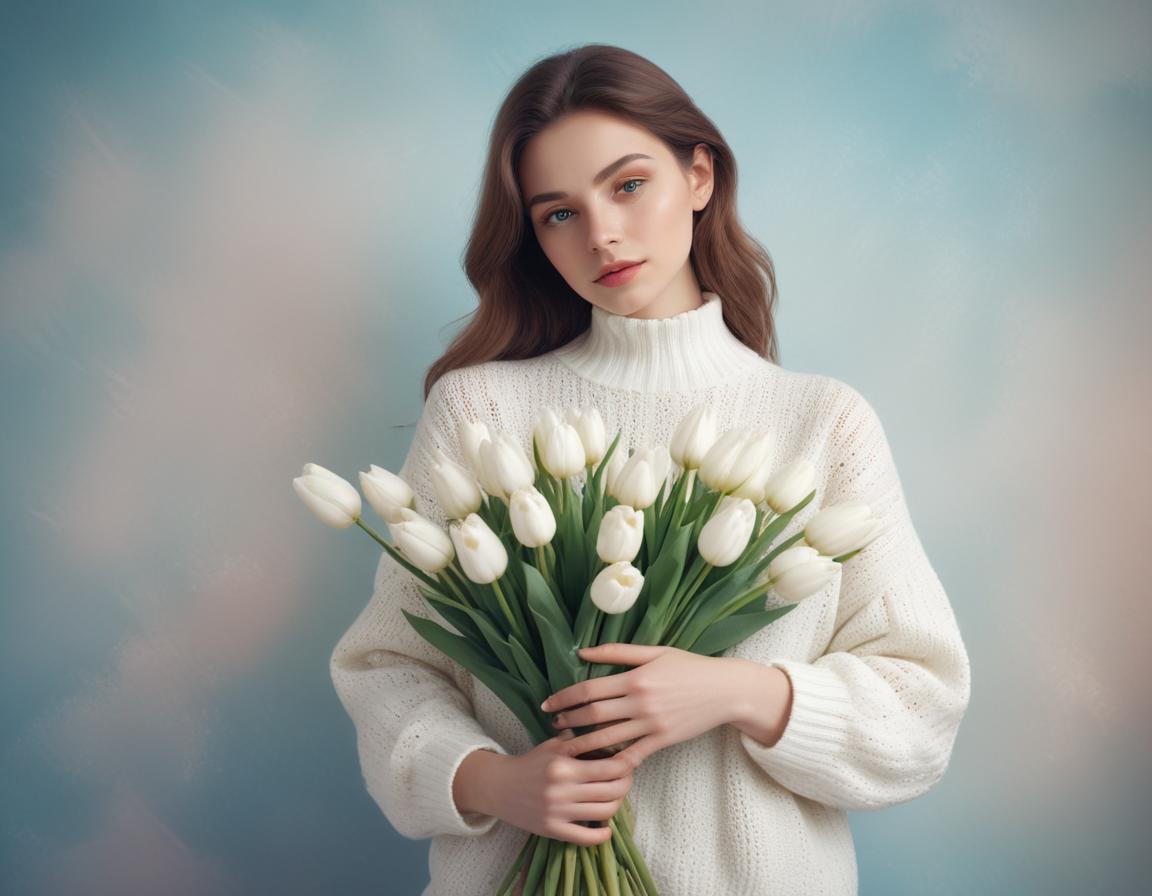 A young woman in a cozy sweater stands indoors, holding a bouquet of fresh white tulips against a soft blue backdrop, conveying serenity.