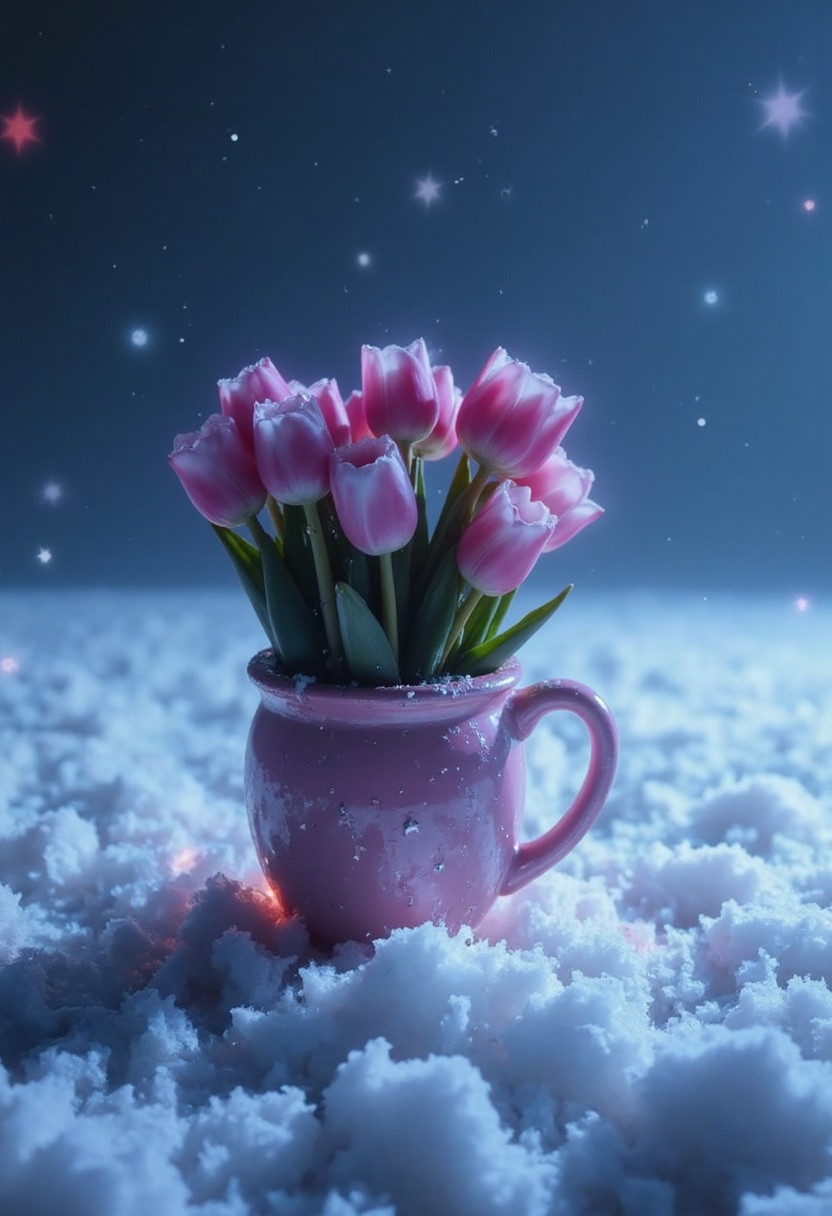 A pink vase holds fresh tulips, contrasting beautifully with snow on the ground under a serene night sky.