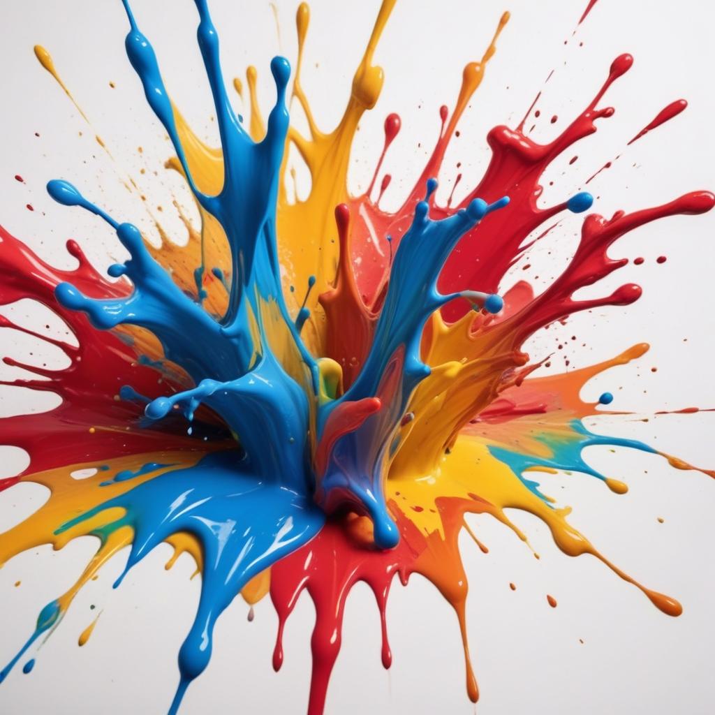Bright blue, red, and yellow paint bursts across a white background, showcasing a vibrant and artistic display of color in mid-motion.