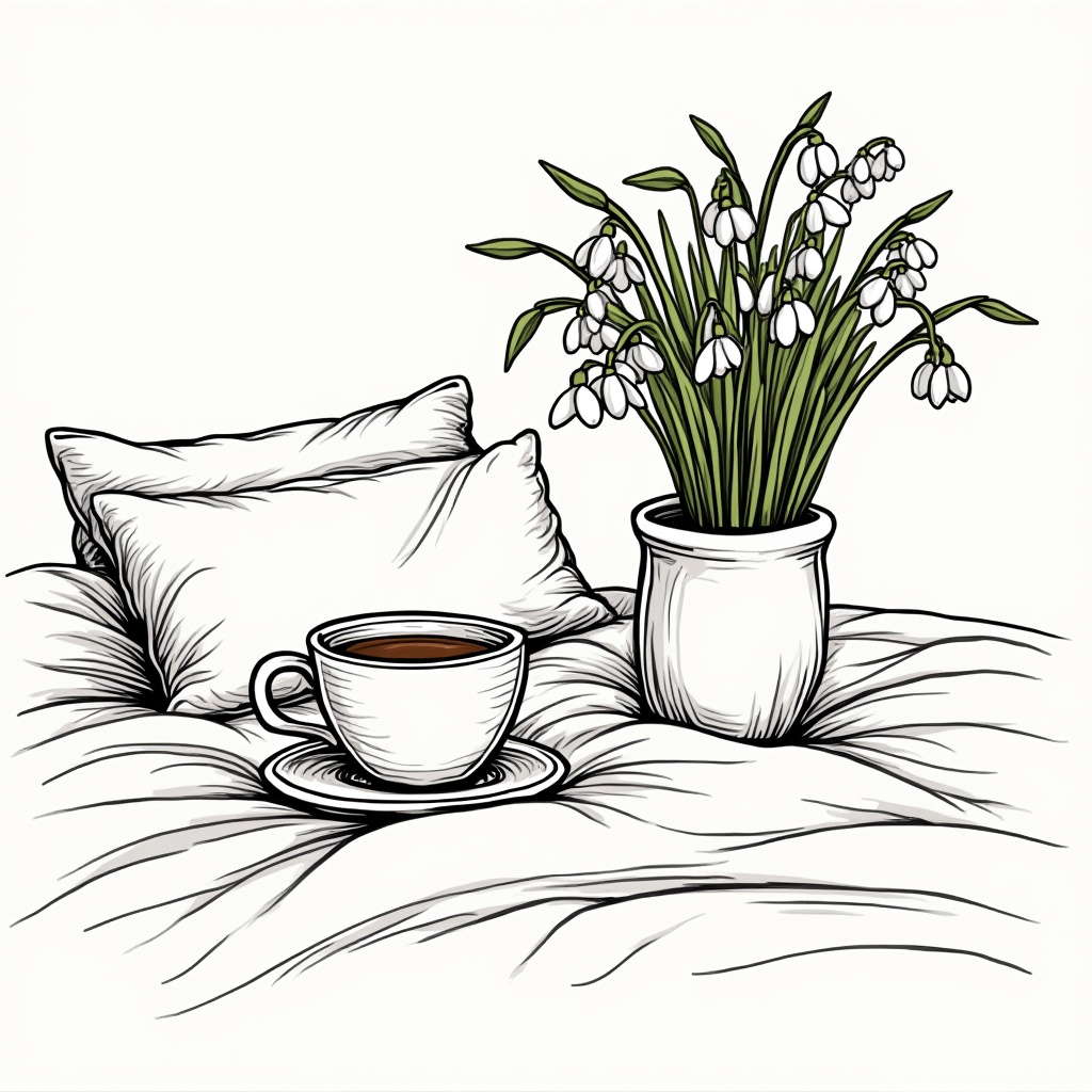 A comfortable bed features a steaming cup of coffee and a vase of snowdrop flowers, creating a warm and inviting morning atmosphere.