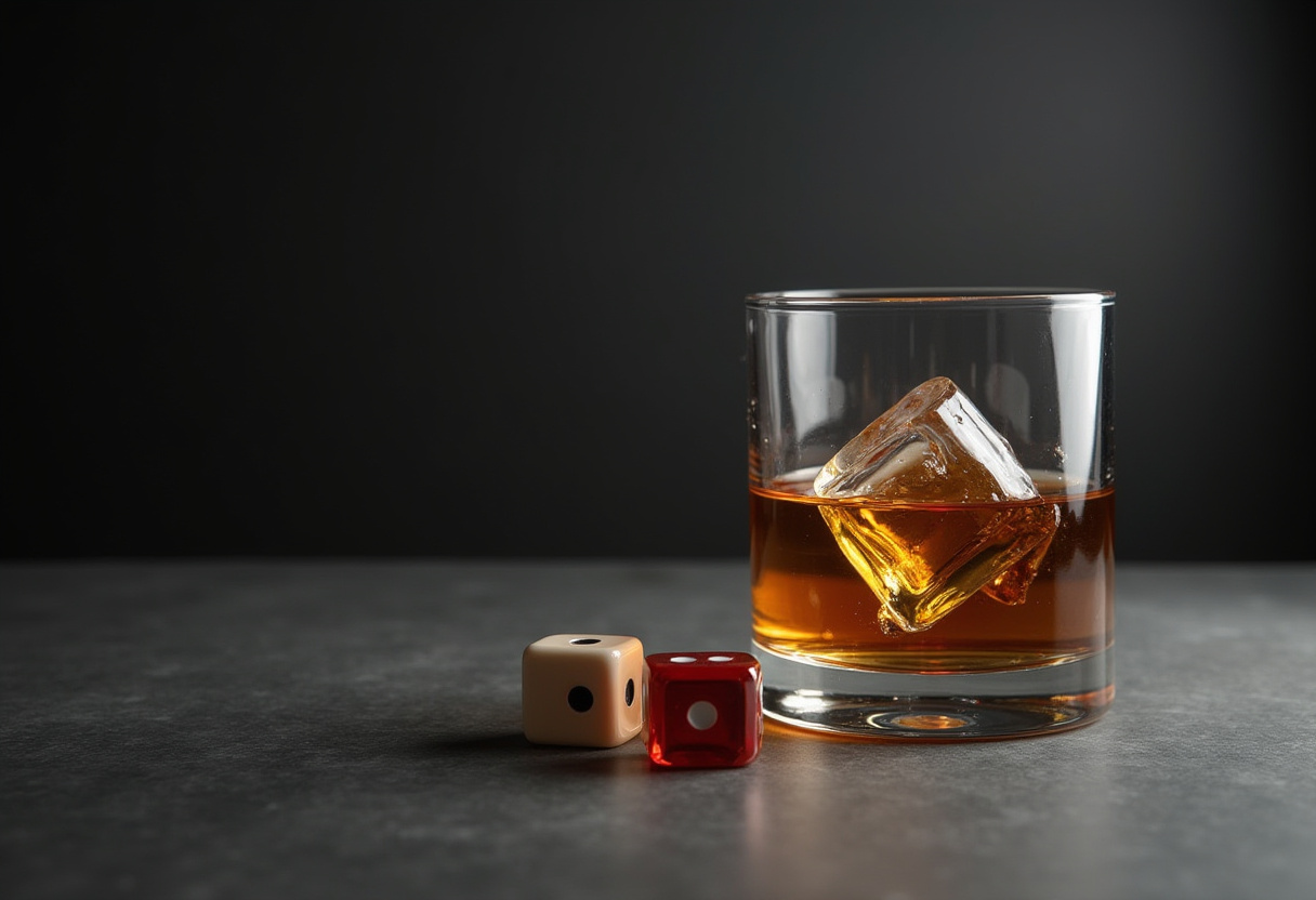 A glass of whiskey sits on a textured surface, featuring ice cubes and two colorful dice nearby, creating a casual atmosphere.