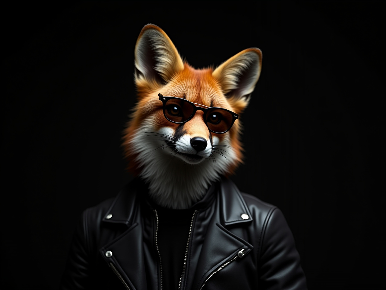 animal, anthropomorphism, art, character, cool, costume, creativity, dark, design, expression, fashion, fox, glasses, imagination, leather jacket, portrait, setting, stylish, trendy, unique