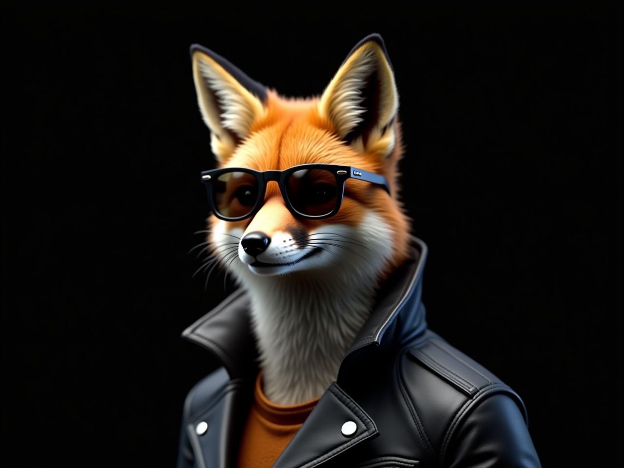 animal, anthropomorphic, art, black background, character, confident, cool, costume, creative, design, edgy, fashion, fox, leather jacket, modern, personality, portrait, stylish, sunglasses, urban