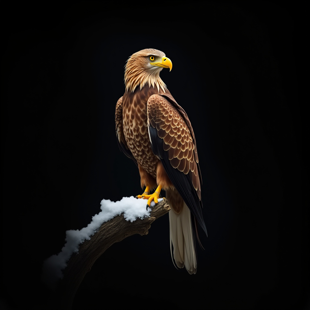 A powerful eagle stands tall on a snow-covered branch, showcasing its intricate feathers against a dark background.