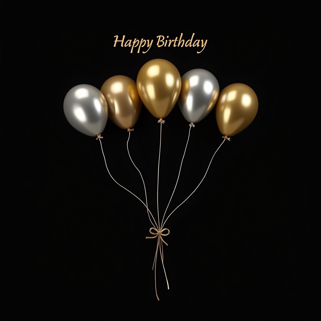 Five shiny gold and silver balloons float gracefully, adorned with a delicate bow, celebrating a birthday occasion joyfully.