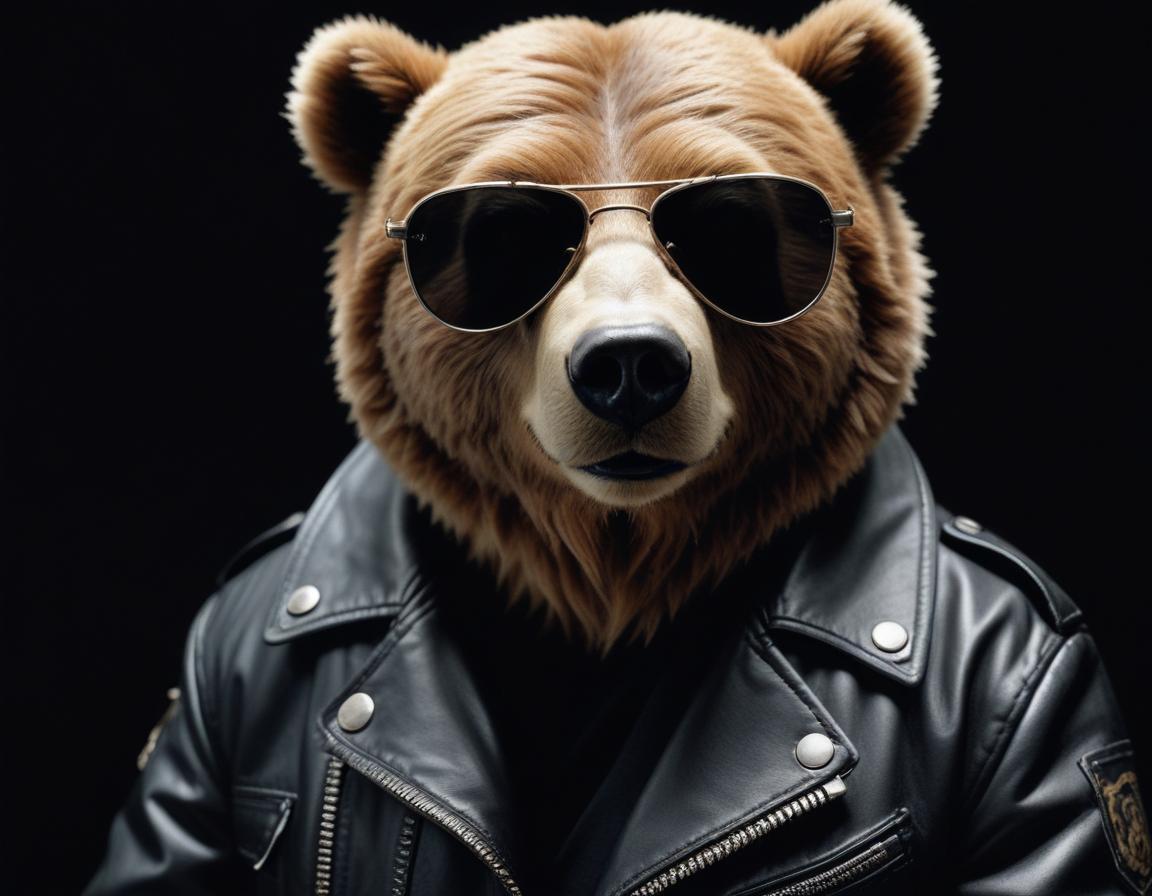 A bear wearing sunglasses and a leather jacket strikes a bold pose against a dark background, exuding a cool and confident vibe.