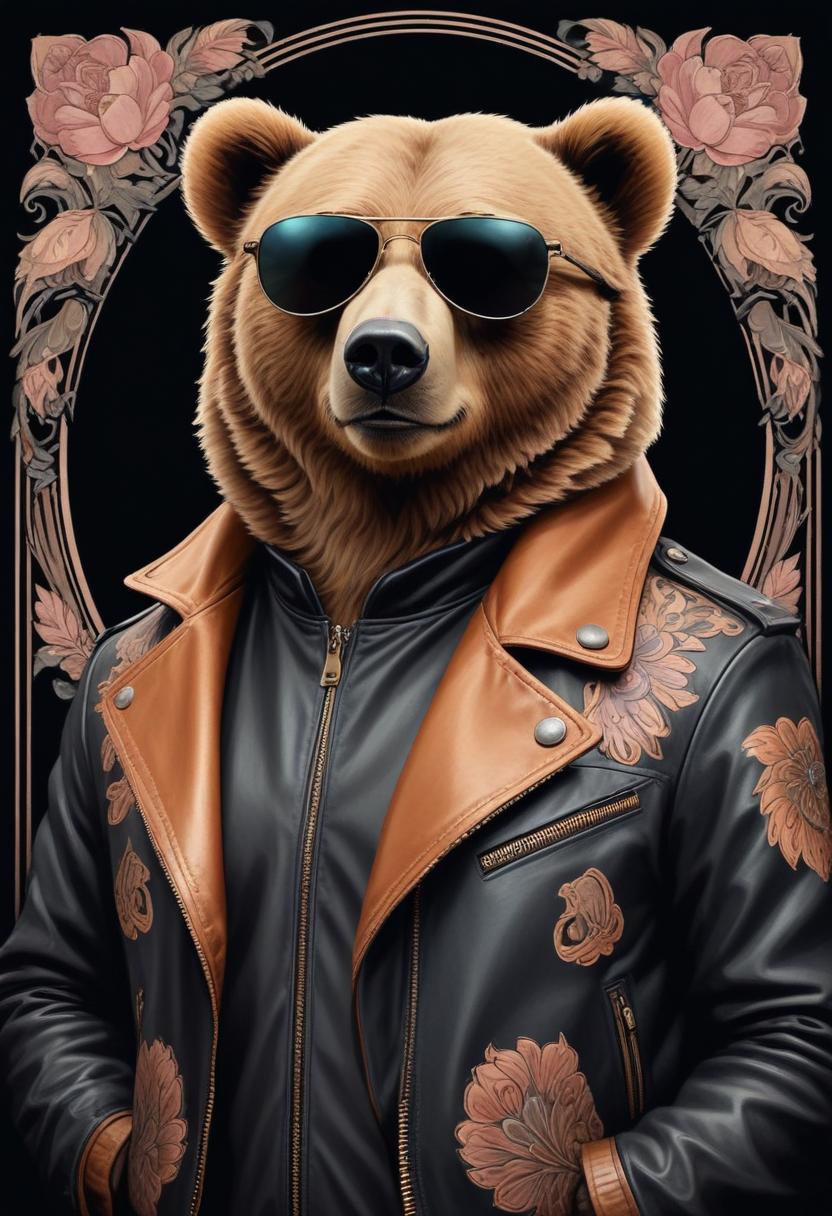 accessories, animal art, anthropomorphic, bear, bear portrait, character design, confident pose, cool, cool attire, creative art, fashion, floral design, illustration, leather, leather jacket, nature, stylish, sunglasses, vintage, wildlife