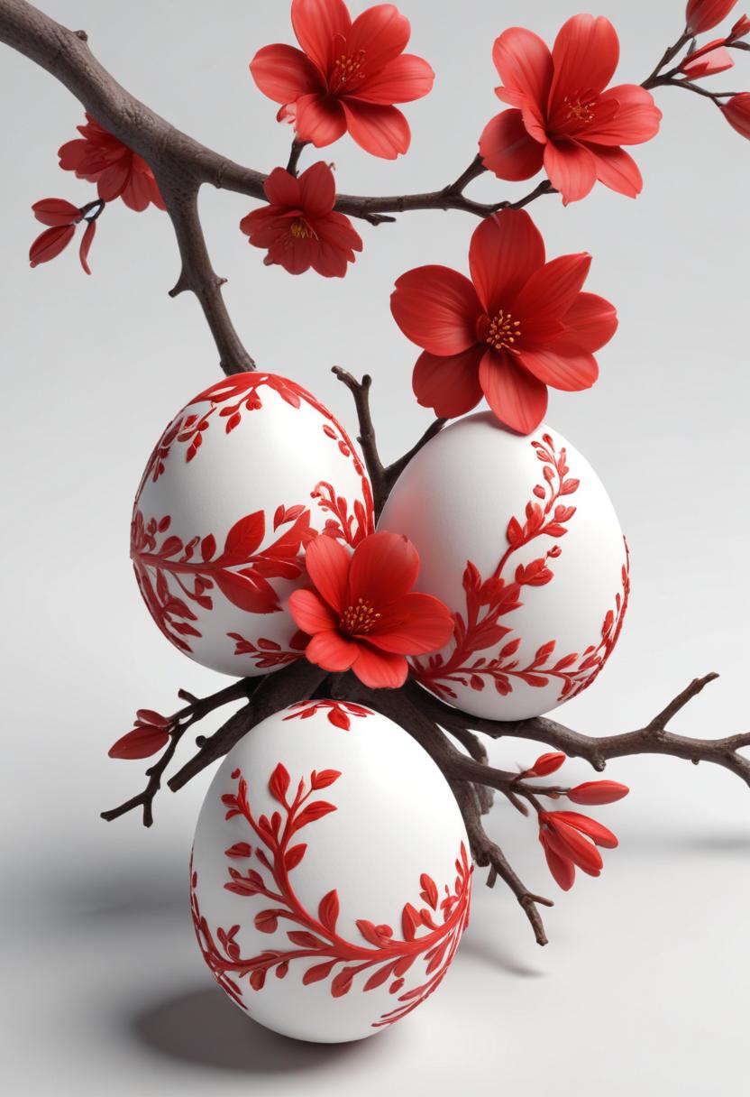 Beautifully painted eggs adorned with red floral patterns rest on a branch with vibrant red blossoms against a light background.