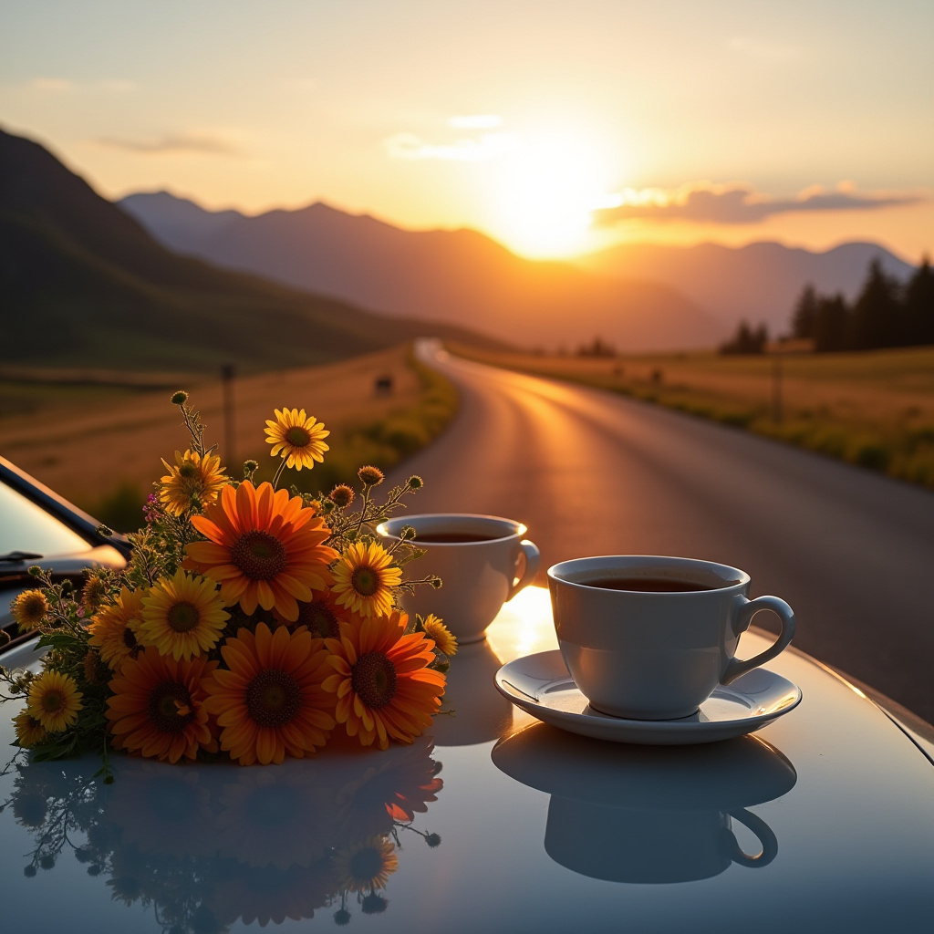 Two cups of coffee sit on a car hood beside a vibrant flower bouquet as the sun rises over a peaceful, winding road in the mountains.