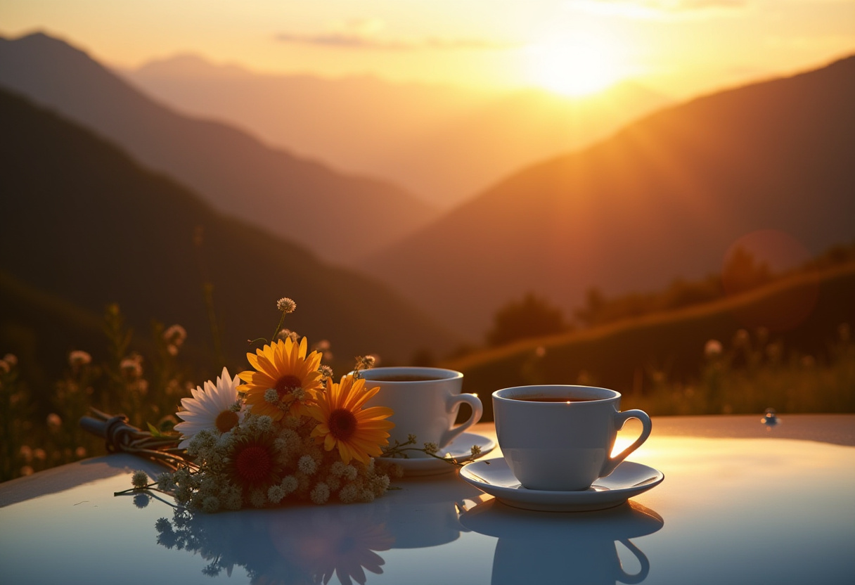 Two cups of coffee sit on a table, accompanied by a bouquet of flowers, as the sun rises over the tranquil mountain landscape.