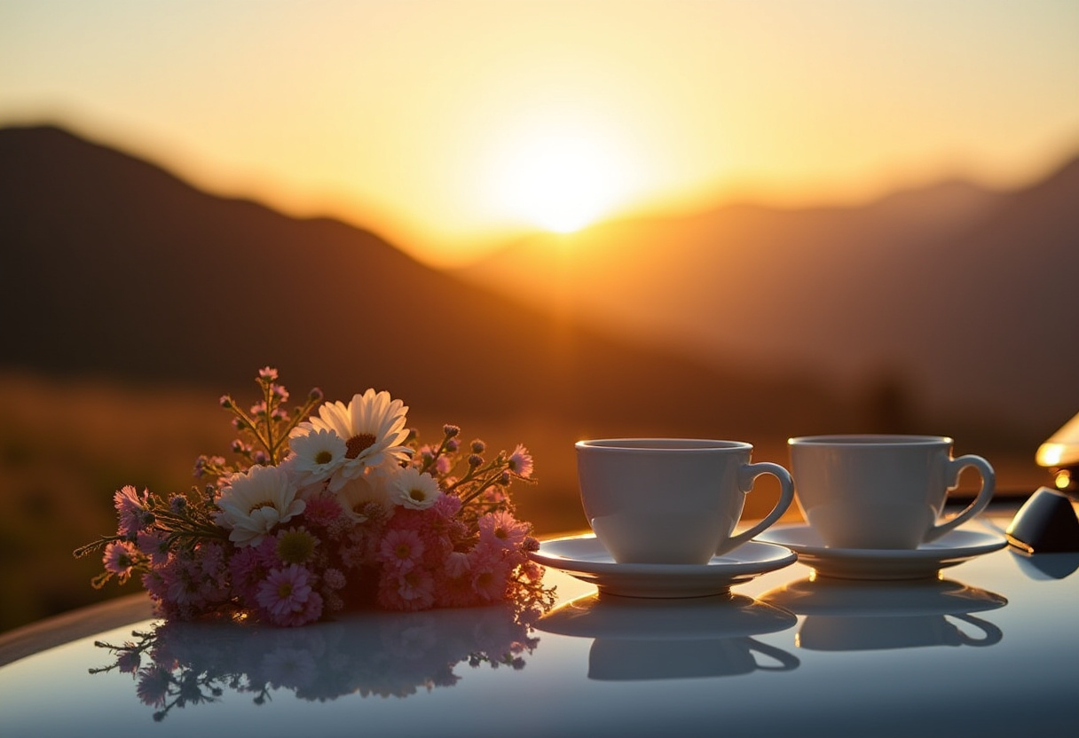 Two tea cups sit beside a floral arrangement on a car hood, illuminated by a warm sunset over layered mountain silhouettes.