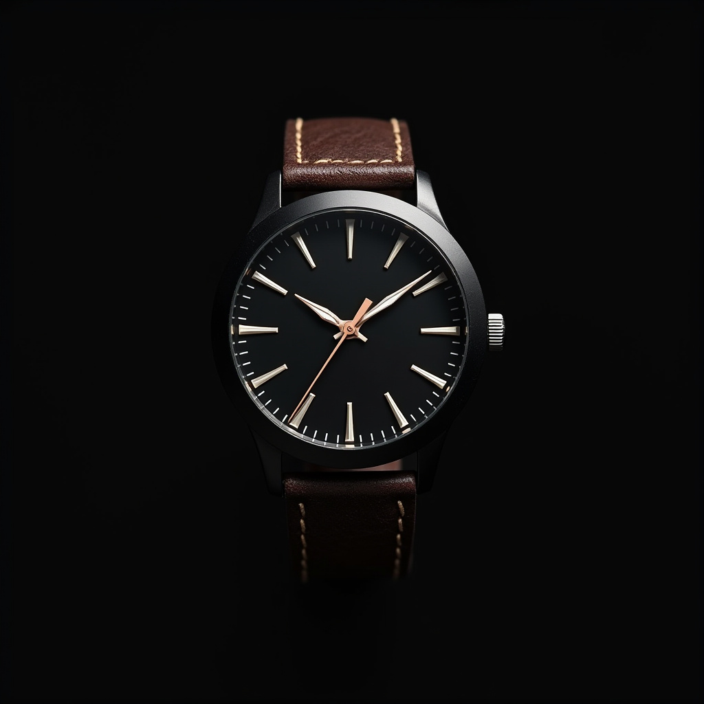 A stylish black watch featuring a brown leather strap is showcased against a dark background, highlighting its sleek design and minimalistic charm.