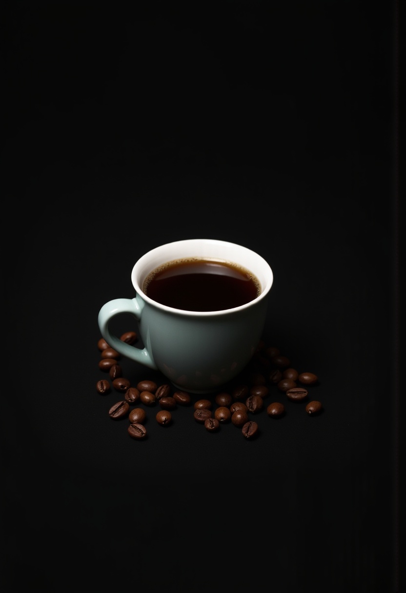 A cup filled with dark coffee is placed on a black background, surrounded by scattered coffee beans, creating a rich and inviting atmosphere.
