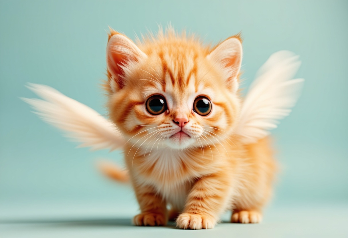 A playful orange kitten with fluffy wings sits against a blue background, giving an adorable and magical vibe to the scene.