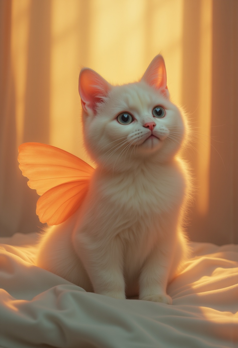 A white cat sits gracefully on soft fabric, adorned with delicate butterfly wings, illuminated by warm sunlight filtering through curtains.
