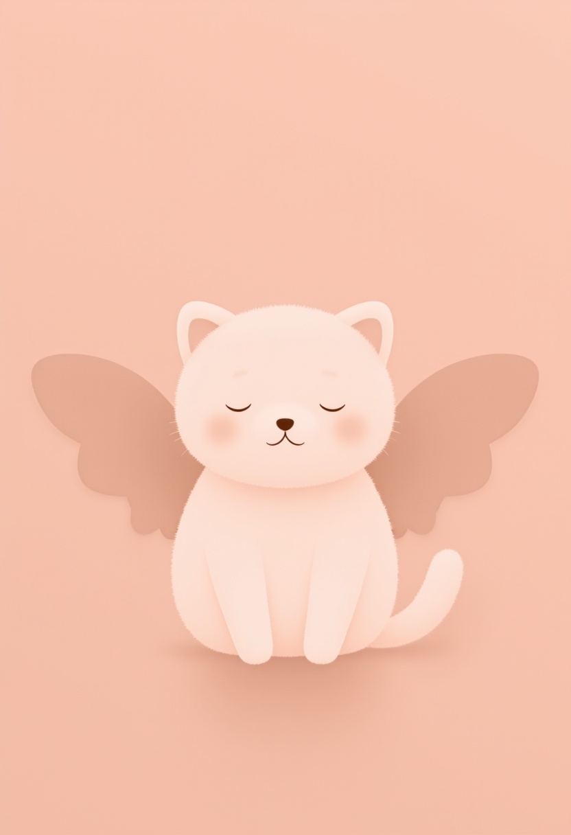 A small, fluffy cat with angel wings sits serenely against a soft peach background, exuding a whimsical and soothing atmosphere.