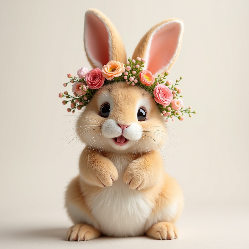 A fluffy bunny with a flower crown smiles cheerfully in a soft studio environment, radiating a joyful and playful spirit.