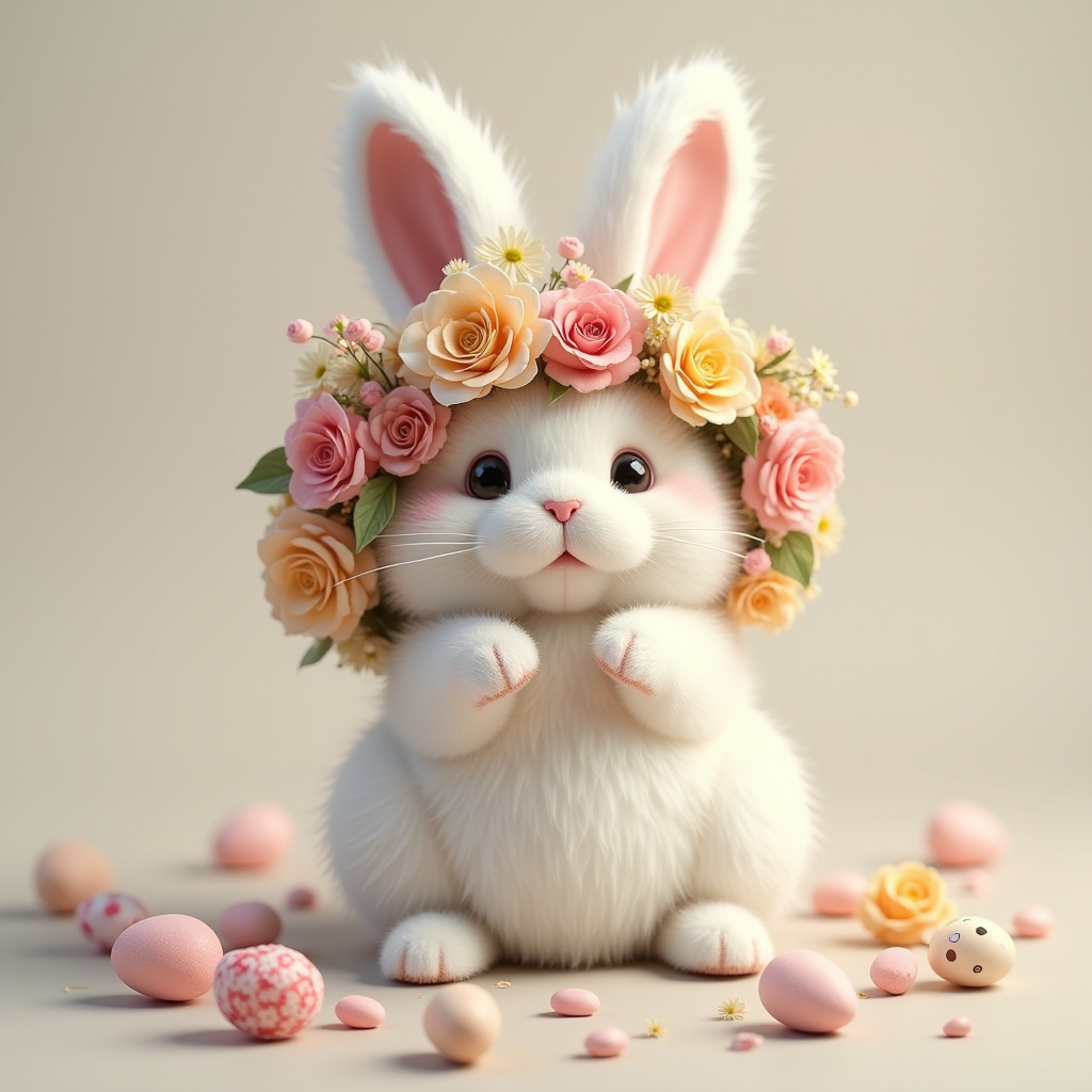 Whimsical white bunny is adorned with a floral crown, surrounded by colorful eggs, creating a delightful springtime atmosphere.