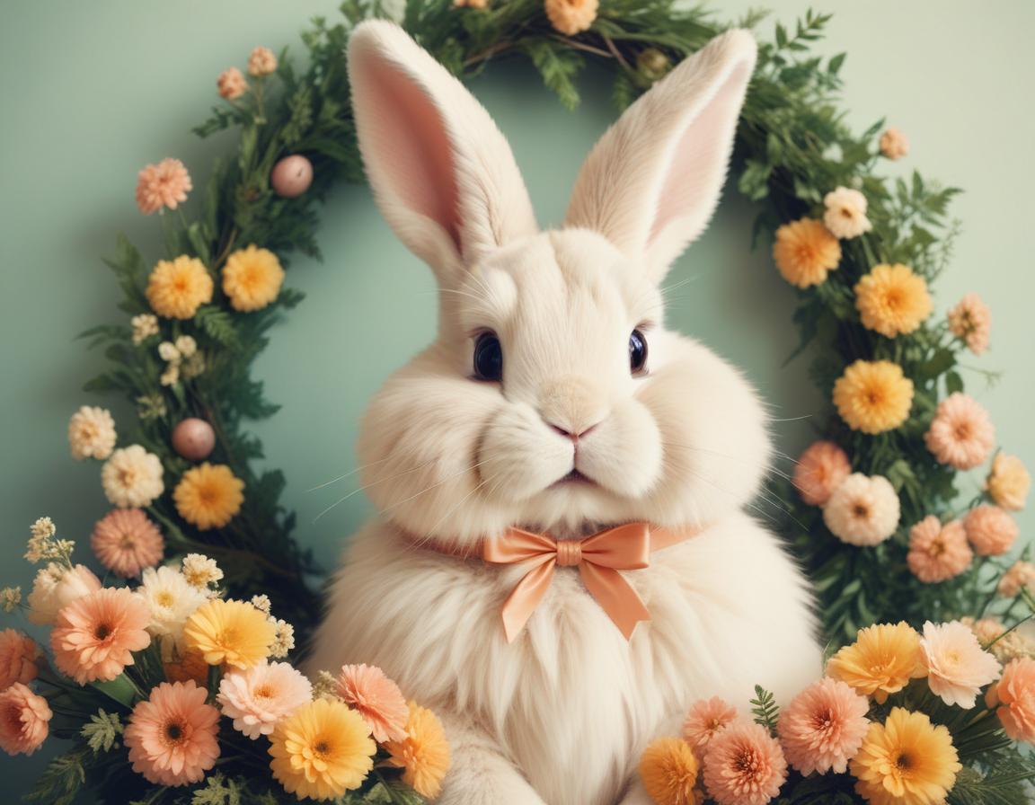 animal, bloom, bow tie, cheerful, colorful, cute, decoration, festive, flowers, fluffy, garden, greenery, habitat, nature, pet, portrait, rabbit, spring, springtime, wreath